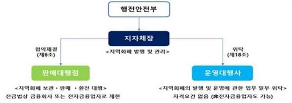 | ▲ 지역사랑상품권 운영구조 지역사랑상품권법에 따르면, 지자체장은 협약 체결 또는 업무 위탁 등을 통해 지역사랑상품권 사무의 일부를 사업자가 수행할 수 있도록 한다. |