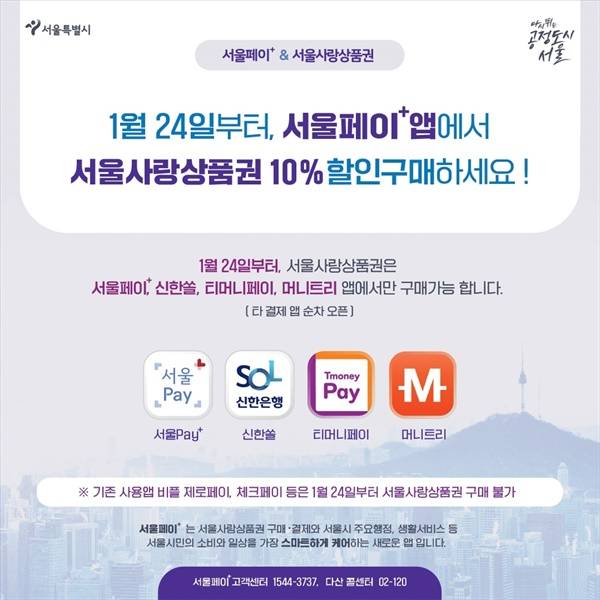 | ▲ 서울페이+&서울사랑상품권 서울사랑상품권은 서울페이+, 신한은행, 티머니페이, 머니트리 앱에서 할인구매할 수 있다. 3월부터는 신한카드 앱에서도 구매 가능하다. |