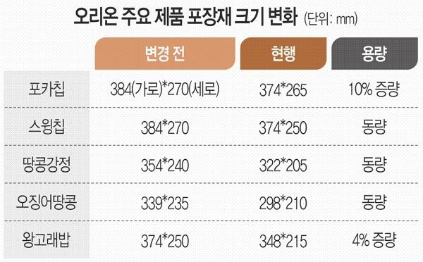 오리온은 7년간 착한포장 프로젝트로 포카칩을 비롯해 스윙칩, 오징어땅콩, 왕고래밥 등 21개 제품의 포장재를 줄였다. 포카칩의 경우 포장 사이즈를 줄인 대신 용량을 60g짜리는 66g으로, 124g짜리는 137g으로 증량해 제품 내 빈 공간 비율을 25% 미만으로 낮췄다. 환경부가 제한하는 기준(35%)보다 훨씬 낮은 수준이다.