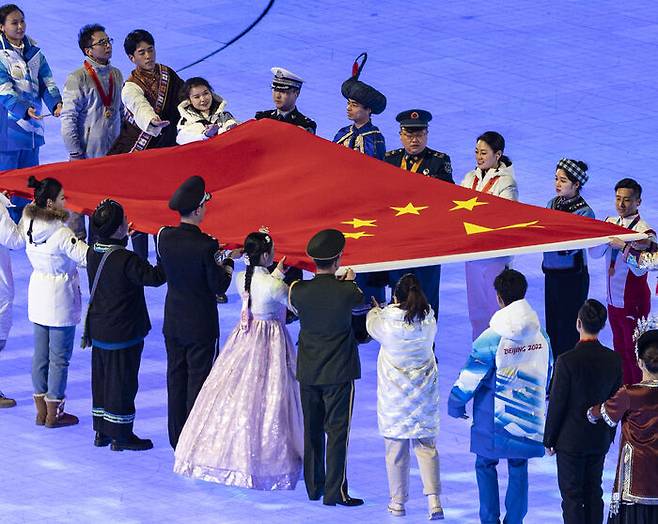중국 내 소수민족 대표로 참여한 한 여성이 댕기머리를 하고 누가 보아도 한복을 보이는 흰색 저고리와 분홍빛 치마를 입은 채 중국의 국기인 오성홍기를 전달하는 퍼포먼스를 진행했습니다.