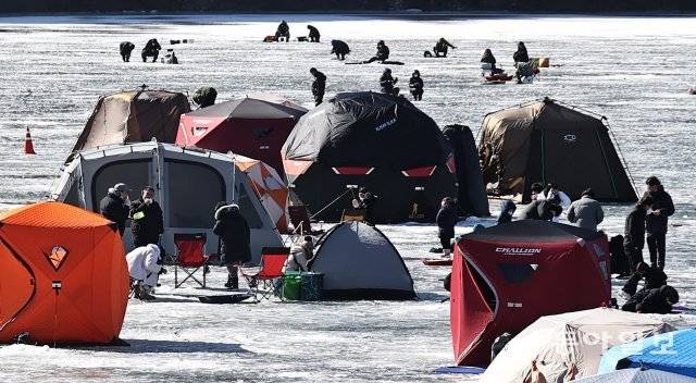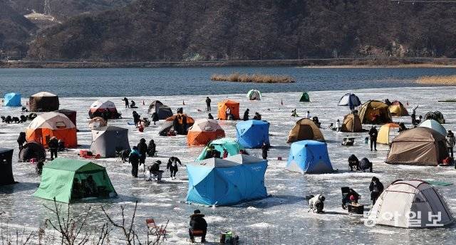 2월의 첫 주말인 6일 강원 춘천 의암호가 만들어낸 빙판 위에는 알록달록 가지각색의 텐트들이 모여 있었다. 두껍게 얼어붙은 춘천의 빙판은 입춘 소식에도 아직 녹을 생각이 없는 듯 구멍을 뚫으려는 사람들과의 버티기가 계속 됐다.