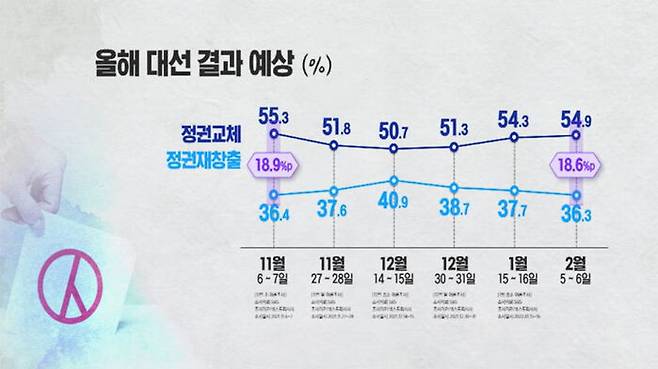 여권 후보에게 유리한 정권 재창출 여론은 소폭 내리고, 야권 후보에 유리한 정권 교체 여론은 소폭 오르는 12월 중순부터의 흐름이 이번에도 계속 이어졌습니다.
