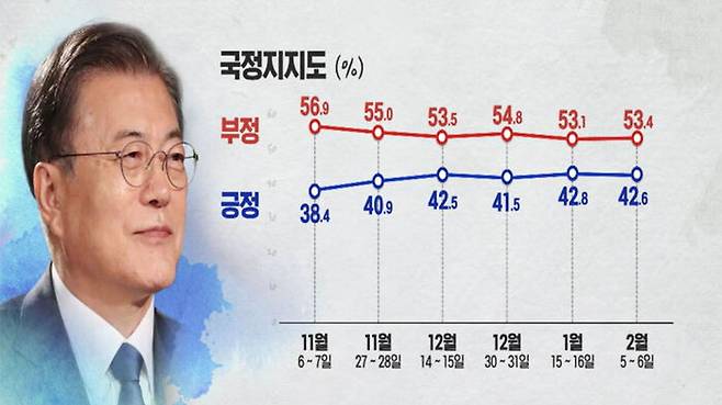 잘하고 있다라는 긍정 응답 40%대 초반, 잘 못하고 있다 50%대 초반으로 12월 중순부터의 추세가 그대로 이어지고 있습니다.