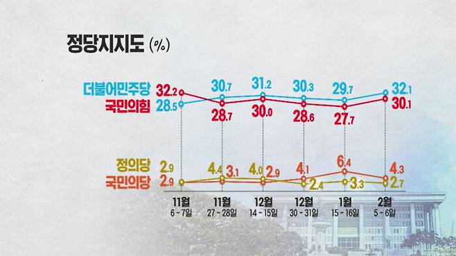 민주당과 국민의힘 모두 두 차례 연속 떨어졌었는데, 이번에는 양당 똑같이 2.4%포인트씩 올랐습니다.