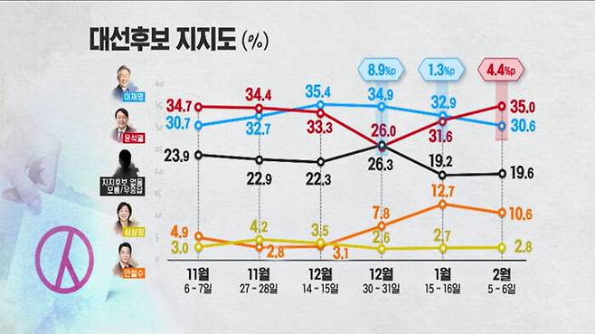 지난해 연말 조사에서는 이 후보가 오차범위를 벗어나 8.9% 포인트 앞서 있었는데, 한 달여 만에 윤 후보가 오차범위 안 접전이지만, 명목상 수치로는 4.4% 포인트 좀 더 높게 나타나는 상황으로 반전됐습니다.