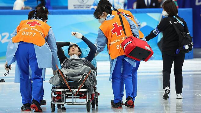 쇼트트랙 남자 대표팀 박장혁이 남자 1,000m 준준결승 레이스 도중 충돌해 들것에 실려 나갔습니다.