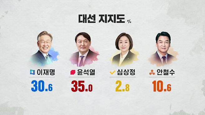 민주당 이재명 30.6, 국민의힘 윤석열 후보 35.0%, 격차는 4.4% 포인트로, 오차 범위 안 접전입니다.