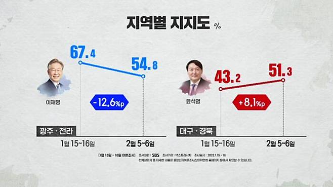 지역별로는 호남에서 이 후보 지지가 12.6% 포인트 하락, TK에서 윤 후보 지지가 8.1% 포인트 상승한 반면, 윤 후보가 앞섰던 서울은 다시 오차범위 안으로 좁혀졌습니다.