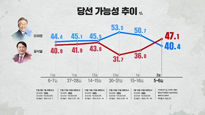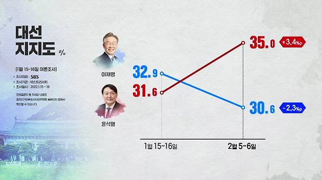 지난달 중순 SBS 여론조사와 비교해보니, 이 후보는 2.3%포인트 하락, 윤 후보는 3.4%포인트 상승했습니다.