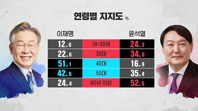이재명, 윤석열 후보의 지지층을 연령대별로 보면, 이 후보는 40·50대에서, 윤 후보는 20·30대와 60세 이상에서 더 많은 지지를 받았습니다.