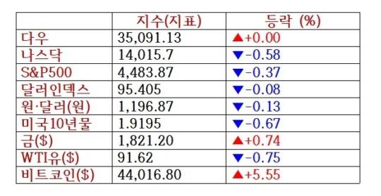 뉴욕증권거래소(NYSE)에서 다우존스30산업평균지수는 전장보다 1.39포인트(0.00%) 오른 3만5091.13에 마감했다. 대형주 위주의 스탠더드앤드푸어스(S&P)500지수는 16.66포인트(0.37%) 내린 4483.87을 기록했고 기술주 중심의 나스닥 종합지수는 82.34포인트(0.58%) 밀린 1만4015.67로 종료했다.
