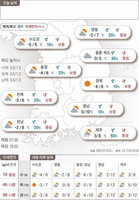 이날 오전 5시 현재 주요 지역의 기온은 서울 -3.7도, 인천 -1.5도, 수원 -4.6도, 춘천 -8.3도, 강릉 -0.7도, 청주 -3.8도, 대전 -4.9도, 전주 -3.8도, 광주 -2.3도, 제주 3.2도, 대구 -1.0도, 부산 0.9도, 울산 -0.3도, 창원 -0.4도 등이다.
