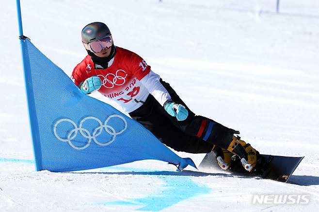 [장자커우(중국)=뉴시스] 김병문 기자 = 8일 오전 중국 허베이성 장자커우 겐팅 스노우파크에서 열린 2022 베이징 동계올림픽 스노보드 평행대회전 남자 예선, 한국 김상겸이 질주하고 있다. 2022.02.08. dadazon@newsis.com
