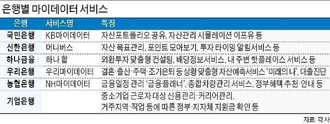 ‘내손 안의 프라이빗뱅커(PB)’로 불리는 마이데이터 서비스를 놓고 각 은행 간 경쟁이 치열하다. 마이데이터는 금융사별로 흩어진 내 신용 정보를 한곳에 모아 조회할 수 있는 서비스다. 은행들은 이를 바탕으로 가장 적합한 금융상품을 추천해주는 기능을 함께 제공하는 등 저마다 ‘고객 모시기’에 나섰다.