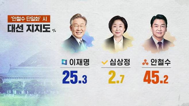 안철수 후보로의 단일화라면 이재명 25.3, 심상정 2.7, 안철수 45.2%로 윤 후보와 안 후보가 각각 10% 포인트, 19.9% 포인트 차이로 이재명 후보에 앞설 것으로 조사됐습니다.