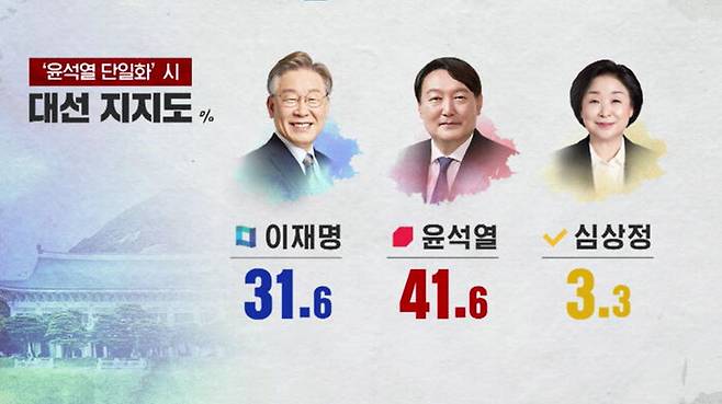 윤 후보가 단일 후보일 경우, 이재명 31.6, 윤석열 41.6, 심상정 3.3%.