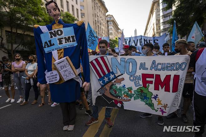 [부에노스아이레스=AP/뉴시스] 8일(현지시간) 아르헨티나 수도 부에노스아이레스에서 시위대가 "IMF 반대"라고 쓰인 현수막을 들고 정부와 국제통화기금(IMF)의 445억 달러(약 54조 원) 상당의 채무 재조정 협상을 규탄하고 있다. 2022.02.09.