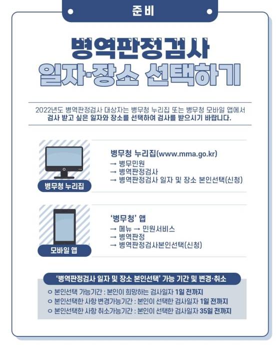 2022년도 병역판정검사 대상자는 병무청 누리집 또는 병무청 모바일 앱에서 검사 받고 싶은 일자와 장소를 선택하여 검사를 받으시기 바랍니다.