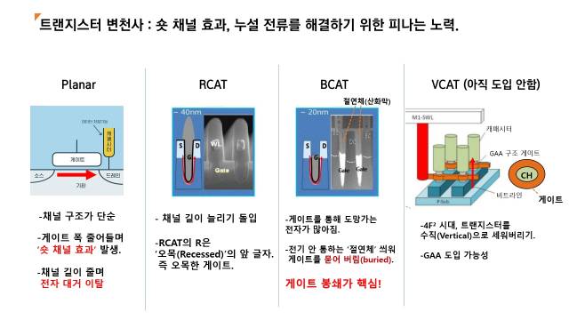 D램은 0 또는 1, 디지털 신호를 저장하는 공간인 셀 영역 구조 변화에 대한 설명이 주를 이뤘습니다. 칩 미세화로 인한 누설 전류(숏 채널 효과)를 해결하기 위해 부단하게 트랜지스터 모양을 변화시킨 사례가 주목됩니다.