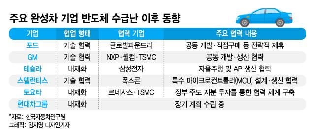 토요타·테슬라·폭스바겐 등 다수 완성차 기업은 반도체 내재화 추진 중이다. 또 재고를 최소화해 비용을 축소하는 JIT(Just-in-Time) 방식에서 핵심 부품을 직접 관리하는 공급망 관리 방식으로 변화도 모색한다.