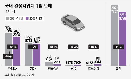 10일 자동차 업계에 따르면 지난해 4분기(10~12월)에 다소 개선되는 듯 보였던 반도체난은 이달 들어 다시 극심해지고 있다. 올해 1월 국내 완성차업체들의 자동차 판매는 52만8788대로 지난해 같은 달에 비해 11.5% 감소했다. 내수 9만3900대(19.2%), 해외가 43만4888대(9.7%) 줄었는데, 반도체 수급 문제가 큰 영향을 끼쳤다는 평가다. 주문을 받아놓고 반도체 때문에 출고를 하지 못한 차들이 많았다는 얘기다.