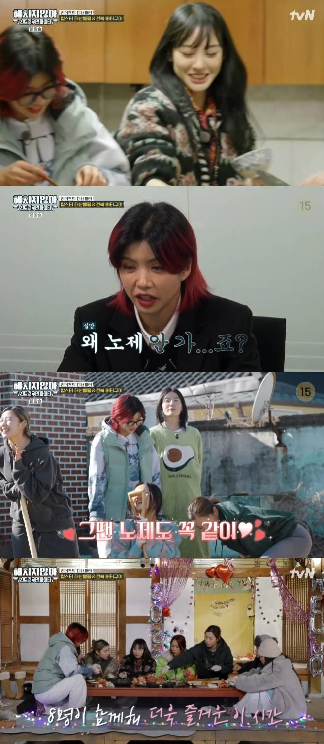 10일 밤 방송된 tvN 예능프로그램 '해치지않아X스우파' 3회(최종회)에서는 완전체가 된 8인 리더들의 폐가 마지막 밤 이야기가 공개됐다.