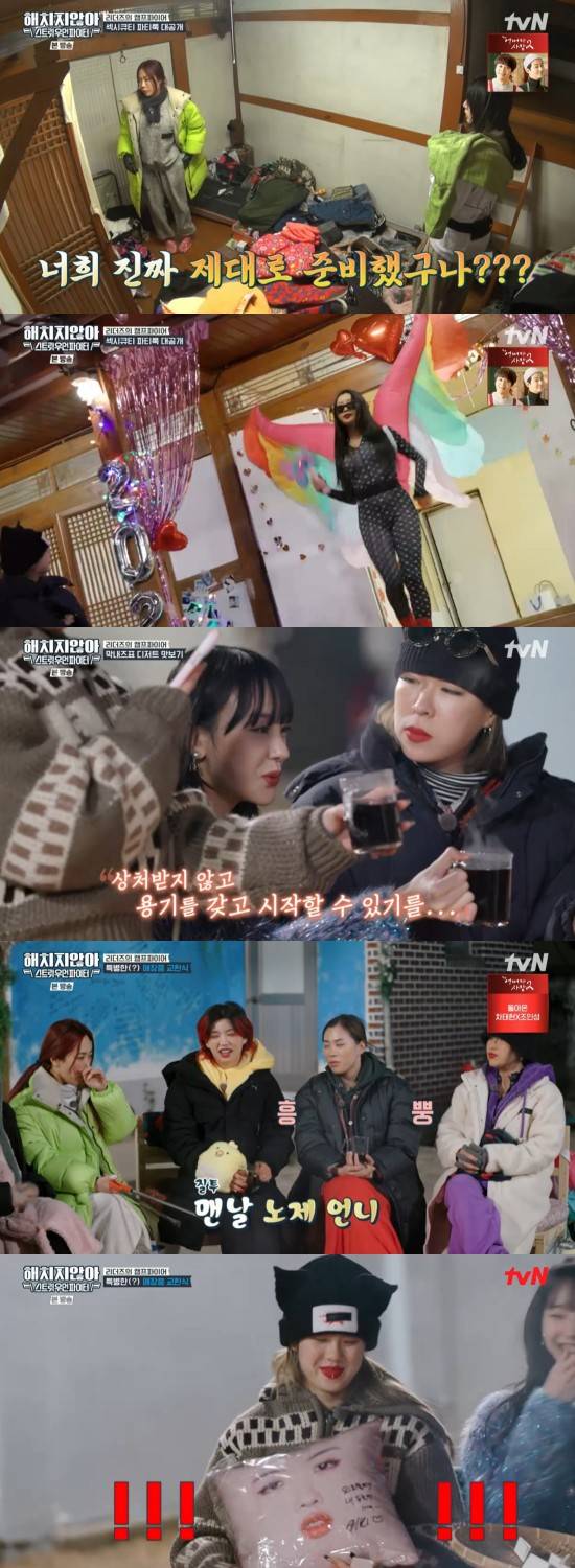 10일 방송된 tvN 예능프로그램 '해치지 않아X스우파'에서는 마지막 촬영을 맞아 파티를 즐기는 리더즈의 모습이 전파를 탔다.