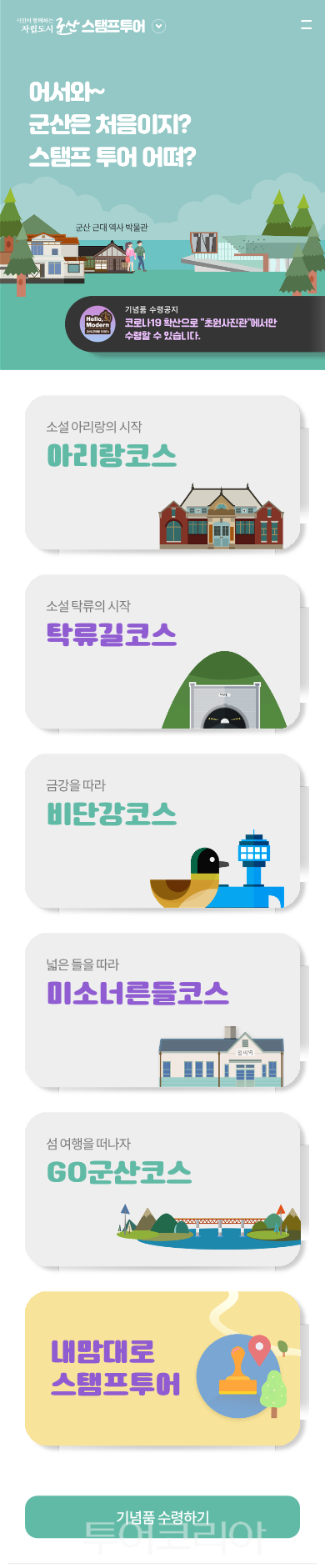 한편, 군산관광 스탬프투어와 관련한 기타 안내는 군산시 문화관광 홈페이지, 군산 스탬프투어 모바일 페이지, 또는 군산시 관광진흥과로 문의하면 자세한 안내를 받을 수 있다.