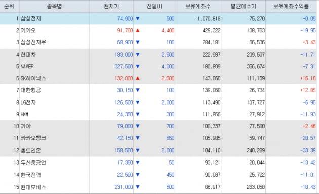 11일 개인들이 가장 많이 이용하는 키움증권의 종목별 보유 계좌수를 조사한 결과 보유 상위 종목 30개 가운데 24개가 마이너스를 기록하고 있었습니다. 보유 1위 삼성전자는 본전(-0.09%) 수준이지만 대부분 종목은 매수가 대비 20~30%의 손실을 기록하고 있습니다.