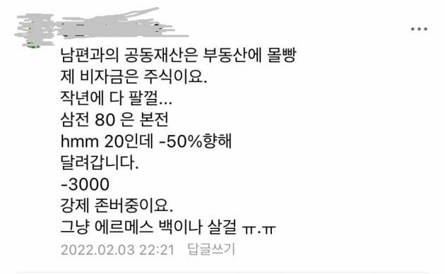 남편 몰래 마련한 ‘비자금’이 묶여버린 사례도 있습니다. 한 레몬테라스 회원은 “비자금을 삼성전자와 HMM에 8:2 비중으로 투자했는데 3000만원 손실을 보고 있다”며 “작년에 주식을 다 팔고 에르메스 가방을 사지 않은 게 후회된다”고 말했습니다.