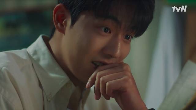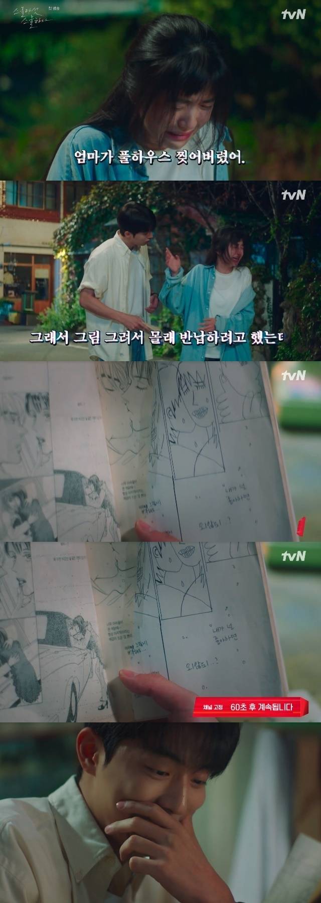 백이진은 도망치는 나희도를 붙잡았지만 나희도가 울기 시작하자 놓아줬다. 그날밤 백이진은 나희도가 직접 그림을 그리고 대사를 써넣어 완성한 만화책을 집에 가져와 읽으며 폭소했다. 특히 백이진을 웃긴 부분은 '내가 널 좋아하면 왜 안돼'를 맞춤법 틀려 '외않되'로 써넣은 부분이었다. (사진=tvN '스물다섯 스물하나' 캡처)