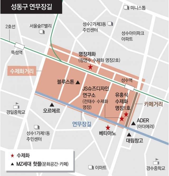 성수동 수제화거리는 1980년대 명동 등이 재개발되면서 수제화 업체들이 성수동으로 옮겨와 형성됐다. 일부는 카페 등이 들어서며 문을 닫았지만, 젊은 장인들은 새로운 판로를 개척하고 있다.