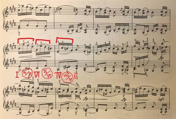 도입부 주제 선율에서 따로 표시해놓은 네 음 기억할 것이다. 다음 악보를 보면, 그 네 음만 떼어내서 세 차례 반복하며 3도 하행하는 부분이 나온다. 아래에는 화성분석을 적어놨는데 큰 줄기로 보면 Ⅰ→Ⅵ→Ⅳ→ⅱ의 순서로 3도 하행하면서도, ◯ 안에 표기된 대로 사이사이에 부속화음이 등장해 화성적 긴장감을 고조시킨다.
