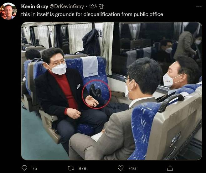 [이데일리 장영락 기자] 윤석열 국민의힘 대선 후보의 열차 좌석 구둣발 민폐가 해외에도 알려졌다. 북한·동아시아 전문가인 케빈 그레이 영국 서섹스대 국제관계학과 교수는 윤 후보 소식을 트윗에 링크하며 “공무 결격사유”라고 지적했다.