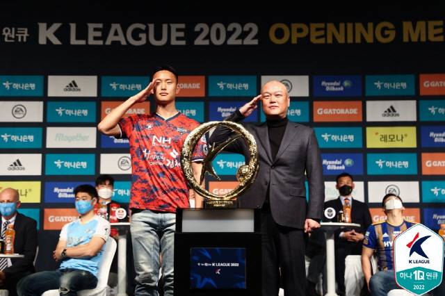 정승현은 14일 오후 서울 용산구 백범김구기념관에서 열린 '하나원큐 K리그1 2022' 오프닝 미디어데이에 김천 대표선수로 참석해 김태완 김천 감독 못지않은 입담을 과시했다.