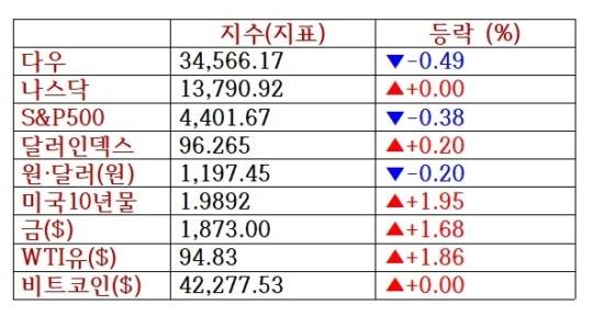 이날 뉴욕증권거래소(NYSE)의 다우존스산업평균지수는 전 거래일보다 171.89포인트(0.49%) 내린 3만4566.17에 거래를 마쳤다. 스탠더드앤드푸어스(S&P)500은 16.97포인트(0.38%) 떨어진 4401.67, 나스닥은 0.24포인트(0.0017%) 하락한 1만3790.92에 마감했다.