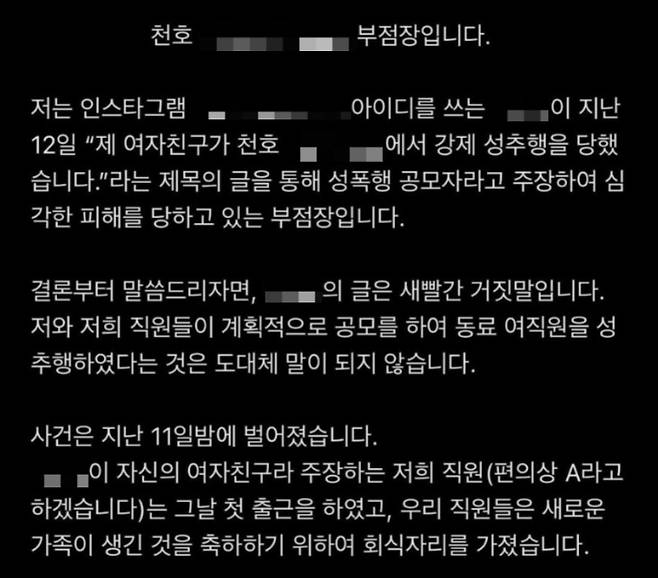 A씨는 "부점장과 점장은 내 여자친구를 본인이 데리고 있겠다면서 욕하고 나를 막무가내로 폭행했다"며 "점장은 부점장과 아르바이트생에게 '오늘 저 X 술 더 먹여서 내가 X먹어야 한다'고 미소 지으며 속삭였다"고 주장하기도 했다.