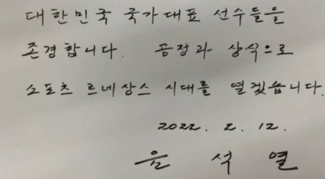 16일 오전 서울 여의도 하우스카페에서 열린 '윤석열과 함께 여는 스포츠 르네상스 시대' 행사에 진종오(2008~2016 올림픽 사격 금메달), 장성호( 2004 아테네 유도 은) 고기현(2002 솔트레이크올림픽 금) 박종훈(1988 서울올림픽 체조 동) 등 올림픽 메달리스트들과 '사라예보 영웅' 이에리사 전 국회의원(전 태릉선수촌장), 프로골퍼 서아람 조윤희 홍진주 등 전현직 국가대표들이 뜻을 함께 했다. 박종길 전 문화체육관광부 차관, 김정남 OB축구회 회장, 유경화 대한배구협회 유소년위원장(1978몬트리올올림픽 여자배구 동) 등도 윤 후보 지지의 뜻을 밝혔다. 이원희(2004아테네올림픽 유도 금),황경선(베이징-런던올림픽 태권도 금) 정지현(2004 아테네올림픽 레슬링 금) 박시헌(1988서울올림픽 복싱 금) 등과 신치용 전 진천선수촌장, 윤동균 전 OB감독 등도 지지 의사를 전했다.
