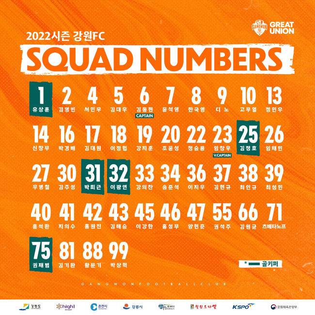 강원, 20222 시즌 등번호 공개.. GK 이광연 32번?