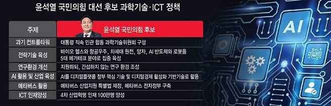 윤석열 국민의힘 대통령 후보는 디지털 플랫폼 정부 구현과 국가과학기술위원회 설치 등을 정보통신기술(ICT)·과학기술 분야 주요 정책으로 내걸었다.