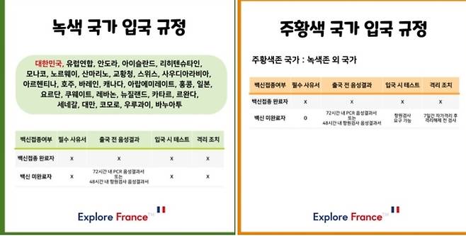 그러나 백신 접종 미 완료자는 프랑스 입국시 72시간 내 PCR 음성결과서 또는 48시간 내 항원 음성결과서를 의무적으로 제출해야 한다. 녹색국가, 주황색 국가가 모두 해당된다.