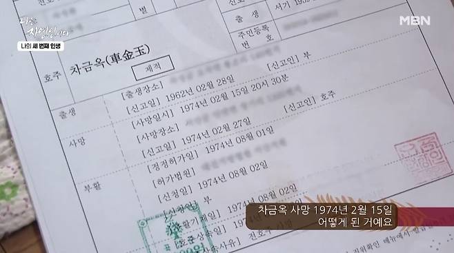 이날 윤택은 차금옥 씨의 제적등본을 보며 "살아계신데 제적등본이 왜 있는 거냐. 아버지가 사망했다고 신고하신 거냐"고 물었다.