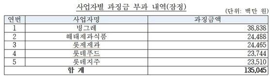 이에 공정위는 위법성을 인식하지 못한 채 소극적으로 담합에 가담한 부산 소재 3개 유통사업자를 제외한 4개 아이스크림 제조․판매 사업자에 대해 총 1350억4500만원의 과징금 부과하기로 결정했다. 빙그레 388억3800만원 해태제과식품 244억8800만원 롯제제과 244억6500만원 롯데푸드 237억4400만원 롯데지주 235억1000만원이 각각 부과됐다.