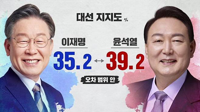 민주당 이재명 후보 35.2% 국민의힘 윤석열 후보 39.2%, 오차 범위 안 접전입니다.