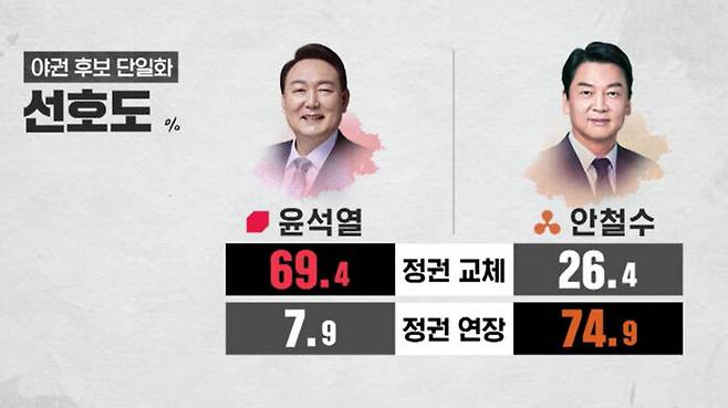'정권 교체' 지지층 가운데서는 윤석열 69.4%, 안철수 26.4%인 반면, '정권 연장' 지지층에선 윤석열 7.9%, 안철수 74.9%로 나타났습니다.