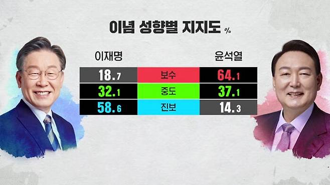 이념 성향별로는 '표심의 풍향계' 중도층에서 이재명 32.1%, 윤석열 37.1%로 오차범위 밖 격차를 보였습니다.
