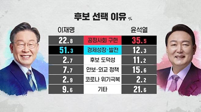 이 후보 지지층은 '경제 발전'을, 윤 후보 지지층은 '공정사회 구현'을 첫손으로 꼽았습니다.