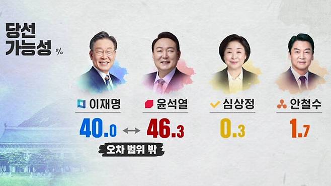 지지도에서는 민주당 이재명 후보와 국민의힘 윤석열 후보가 오차 범위 안에서 접전이었고 당선 가능성에서는 윤석열 후보가 앞서는 것으로 조사됐습니다.