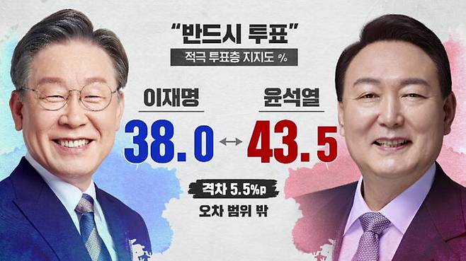 반드시 투표하겠다는 '적극 투표층'에서는 이재명 38%, 윤석열 43.5%로, 윤 후보가 앞섰습니다.