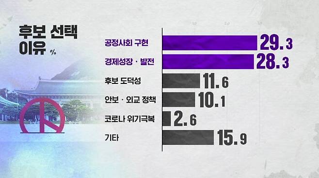 지지 후보 선택 이유에 대해서는, 공정 사회 구현 29.3%, 경제 발전 적임자 28.3%였고, 이어 도덕성, 안보·외교, 코로나 위기 극복 순이었습니다.